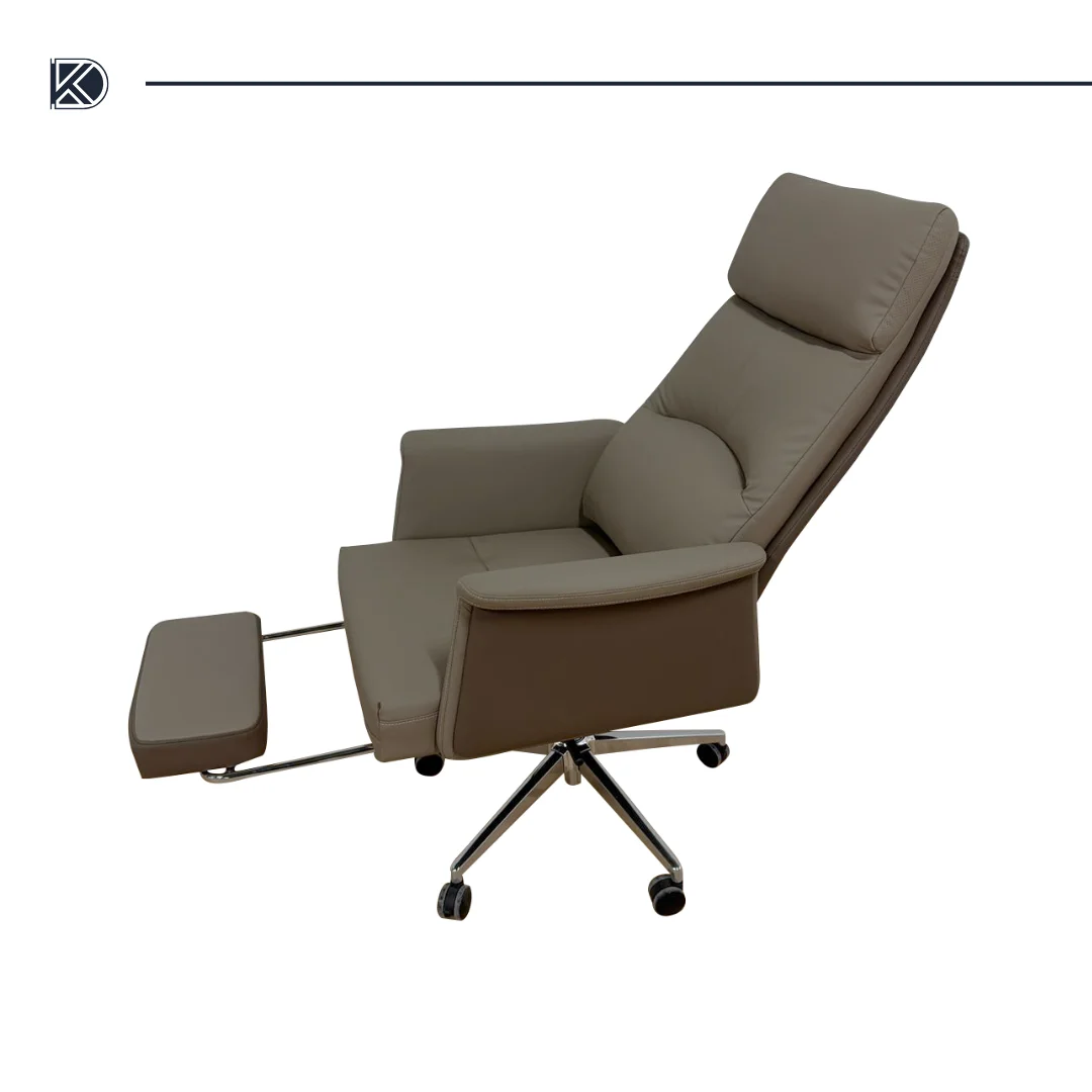 Chaise ergonomique au confort enveloppant, dotée d'un dossier inclinable et d'un repose-pieds escamotable intégré. Sa base chromée pivotante à 360° et ses roulettes en font un siège fonctionnel et mobile pour un usage flexible.