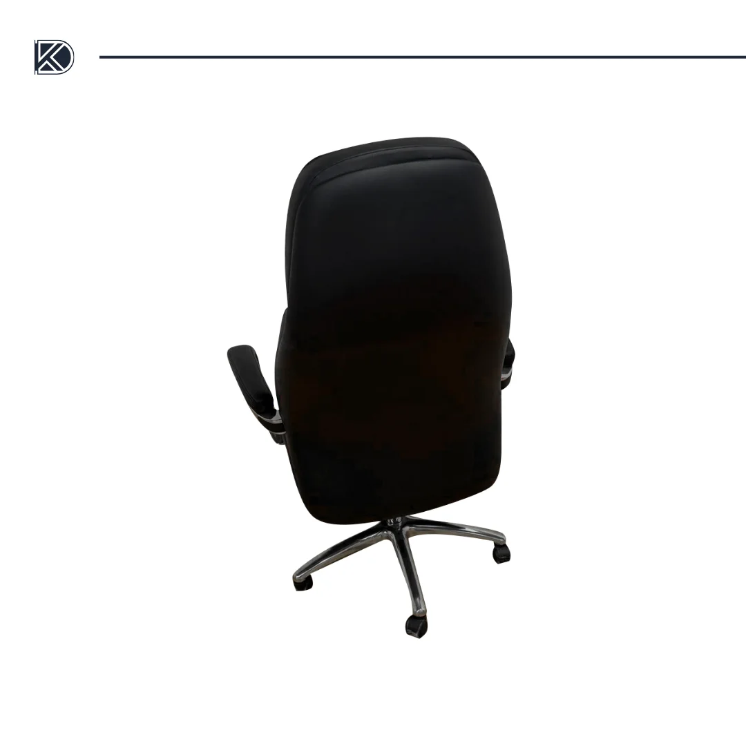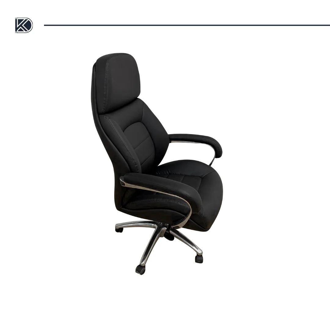 Chaise exécutive en similicuir noir à l'allure professionnelle. Dotée d'un dossier haut avec soutien lombaire, d'accoudoirs rembourrés chromés, d'une base étoile à roulettes et d'un réglage de hauteur par vérin à gaz. Allie confort ergonomique et mobilité.