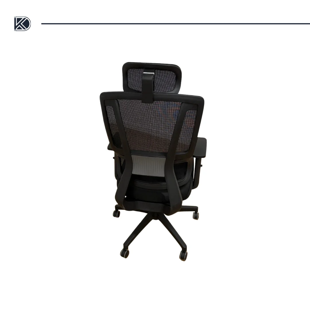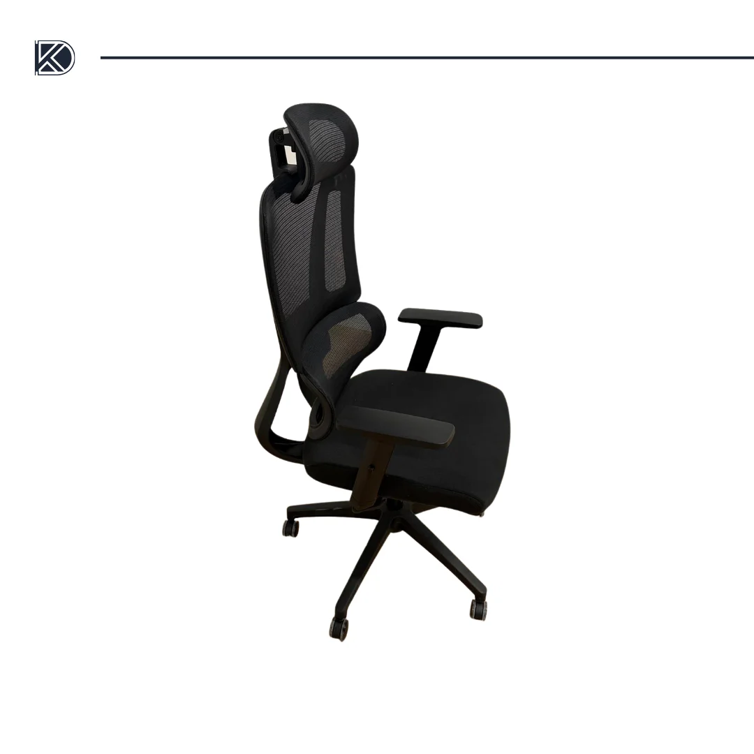 est un modèle ergonomique entièrement en mesh noir, conçu pour le confort sur de longues durées. Elle dispose d'un dossier haut avec un appui-tête et un support lombaire réglables. Elle est également équipée d'accoudoirs ajustables, d'une base pivotante et de roulettes pour une mobilité aisée.